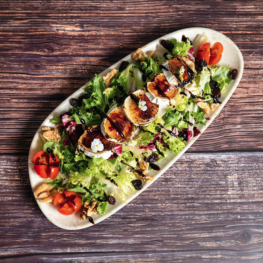 Salade de pousses vertes, fromage de chèvre, noix et raisins secs (5,7) ......................................................... 15 €